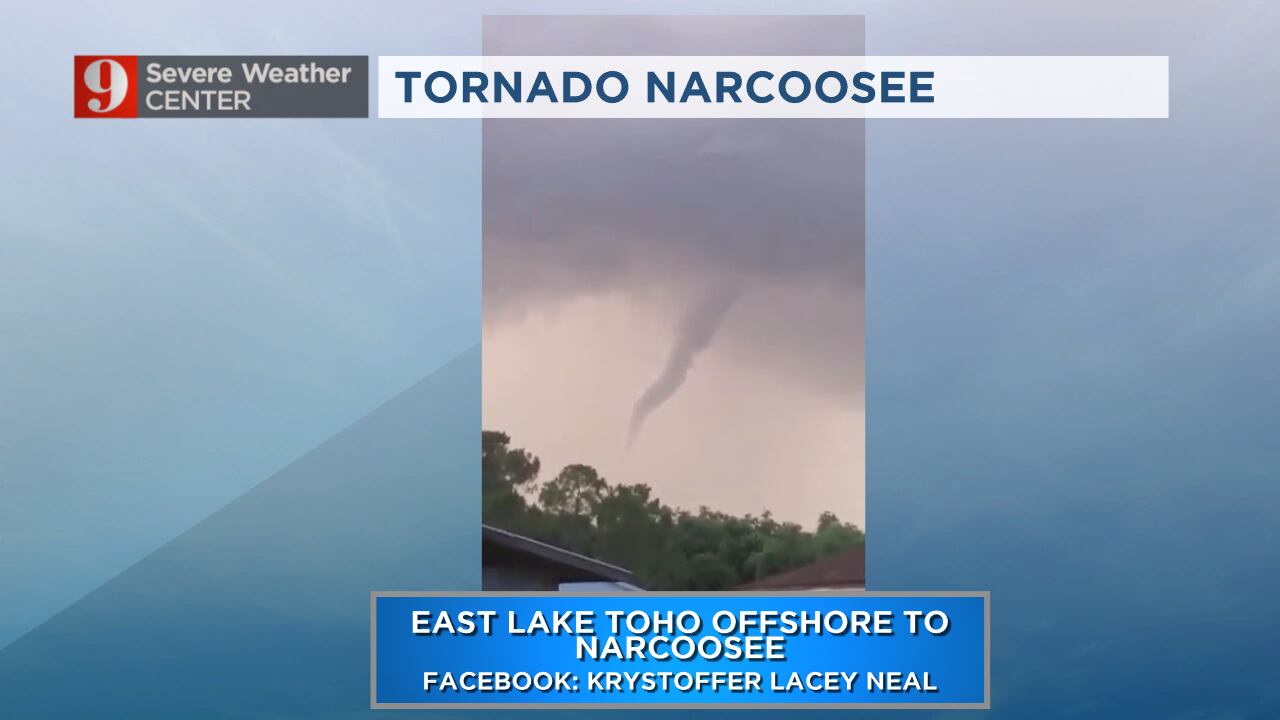 At 8:25 p.m., the National Weather Service put out a statement about the potential of funnel clouds developing near East Lake Toho. At 8:34 p.m., a tornado was confirmed near Narcoosee. About 10 minutes after it was issued, the warning was cancelled.