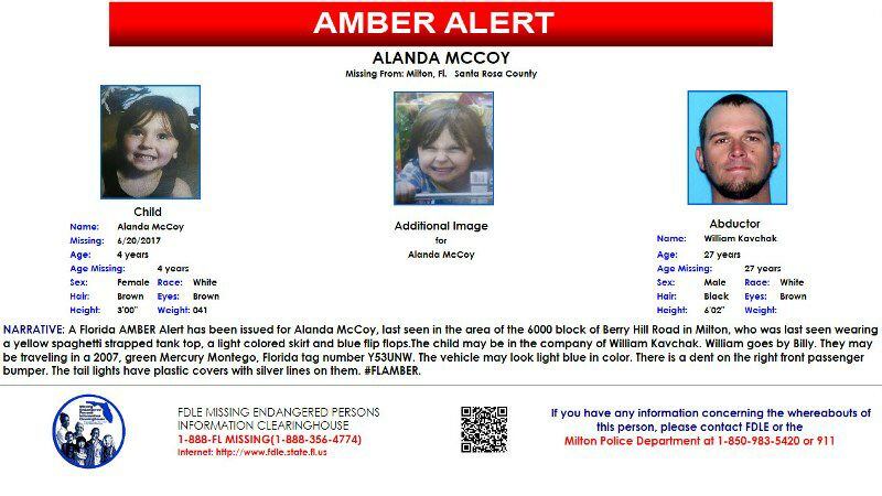A Florida Amber Alert was issued for Alanda McCoy, who was last seen in the area of the 6000 block of Berry Hill Road in Milton, Fla.