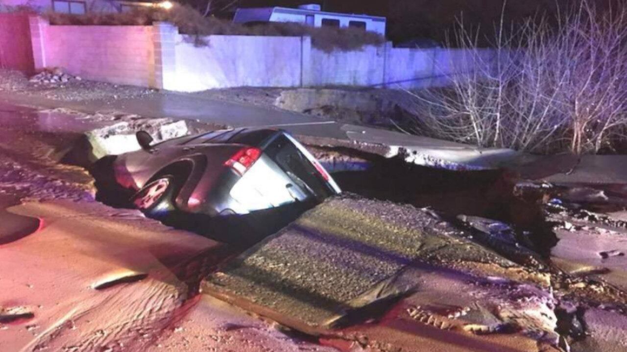 The sinkhole opened up on a street in Rio Rancho. The town's fire department posted an image of the car on its Facebook page, which shows the vehicle resting on its side in the sinkhole.