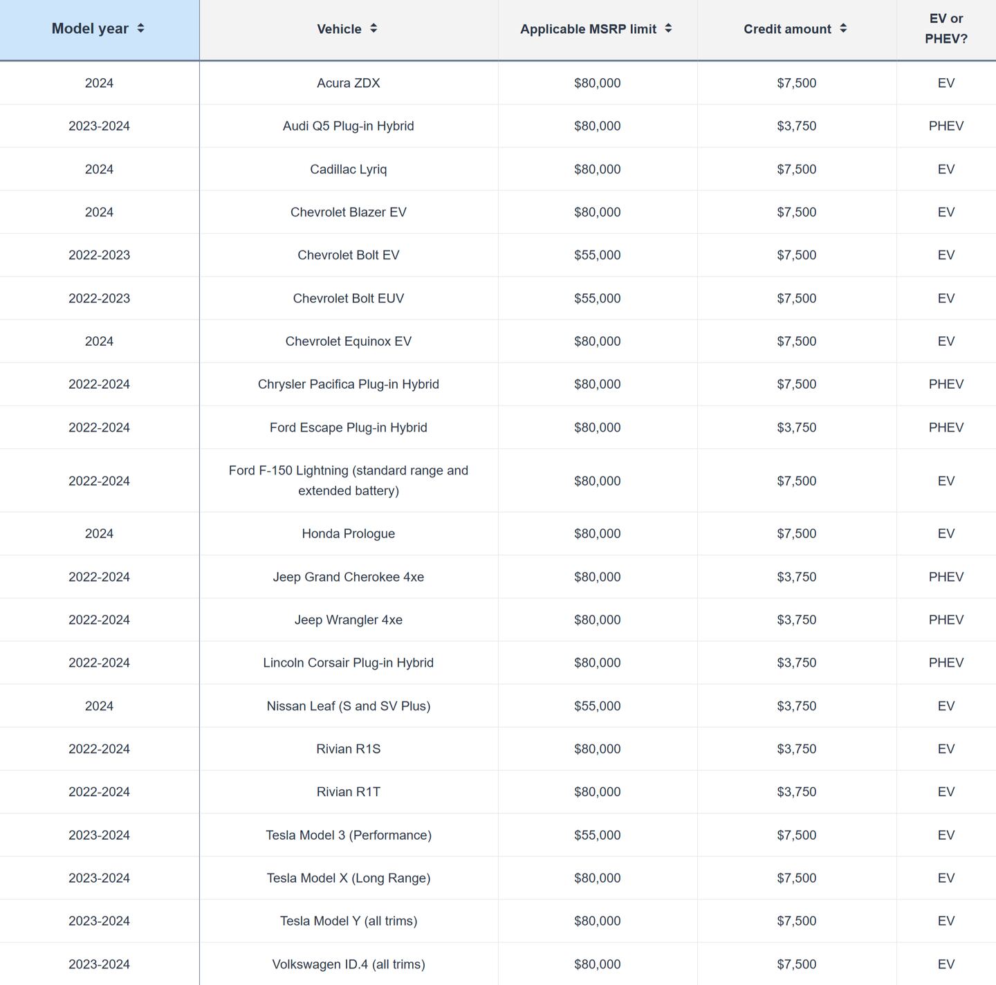 Edmunds kept this list from last year for those who purchased an EV in 2024 and are looking to file their taxes soon. These are the vehicles that were eligible to qualify for up to a $7,500 tax credit.