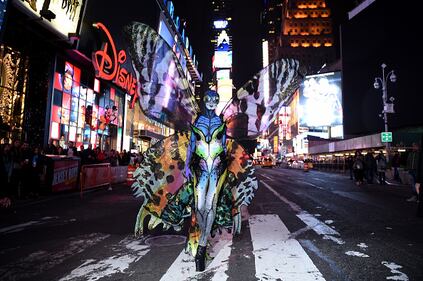 Heidi Klum gives Times Square visitors a sneak peek of her Halloween costume before hosting her annual party at TAO Downtown sponsored Bby Moto X on October 31, 2014 in New York City. (Photo by DimitriosKambouris/Getty Images for Heidi Klum)