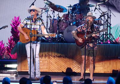 2023 CMAs: Alan Jackson and Zac Brown perform onstage in a tribute to the late Jimmy Buffett. (Christopher Polk/Variety via Getty Images)