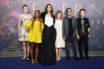 Photos: Angelina Jolie, 'Eternals' stars walk the red carpet at UK premiere Angelina Jolie, third from left, poses with her children Shiloh Jolie-Pitt, from left, Zahara Jolie-Pitt, Vivienne Jolie-Pitt, Maddox Jolie-Pitt and Knox Jolie-Pitt upon arrival at the premiere of the film "Eternals" on Wednesday, Oct. 27, 2021, in London. (Joel C. Ryan/Invision/AP)