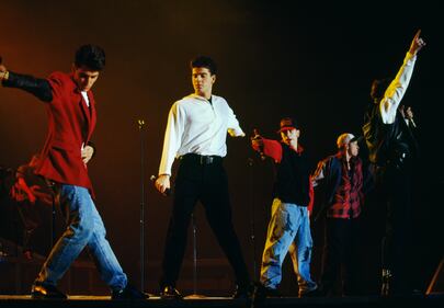 Photos: New Kids on the Block through the years 1990: American boy band New Kids on the Block at the Sheraton Skyline Hotel, Heathrow, London, on April 25, 1990. (Dave Hogan/Hulton Archive/Getty Images)