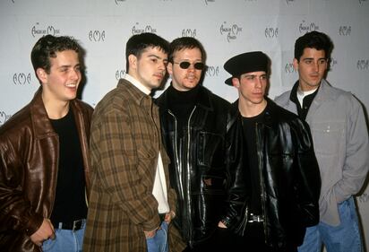 Photos: New Kids on the Block through the years 1994: New Kids on the Block (left to right): Joey McIntyre, Jordan Knight, Donnie Wahlberg, Danny Wood and Jonathan Knight at the 21st annual American Music Awards on February 27, 1994. (Vinnie Zuffante/Michael Ochs Archives/Getty Images)