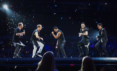 Photos: New Kids on the Block through the years 2012: Jordan Knight, Danny Wood, Donnie Wahlberg, Joey McIntyre and Jonathan Knight of New Kids on the Block perform on stage during the NKOTBSB tour at the O2 Arena on April 28, 2012, in London. (Christie Goodwin/Redferns)