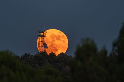 Views of the full strawberry moon from around the world MADRID, SPAIN - 2024/06/21: The full moon of June known as Strawberry Moon rises over a fire lookout tower coinciding with the summer solstice. (Photo by Marcos del Mazo/LightRocket via Getty Images) (Marcos del Mazo/LightRocket via Getty Images)
