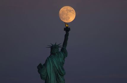 Views of the full strawberry moon from around the world JERSEY CITY, NJ - JUNE 20: The Strawberry Moon rises behind the Statue of Liberty as the sun sets on the summer solstice in New York City on June 20, 2024, as seen from Jersey City, New Jersey. (Photo by Gary Hershorn/Getty Images) (Gary Hershorn/Getty Images)