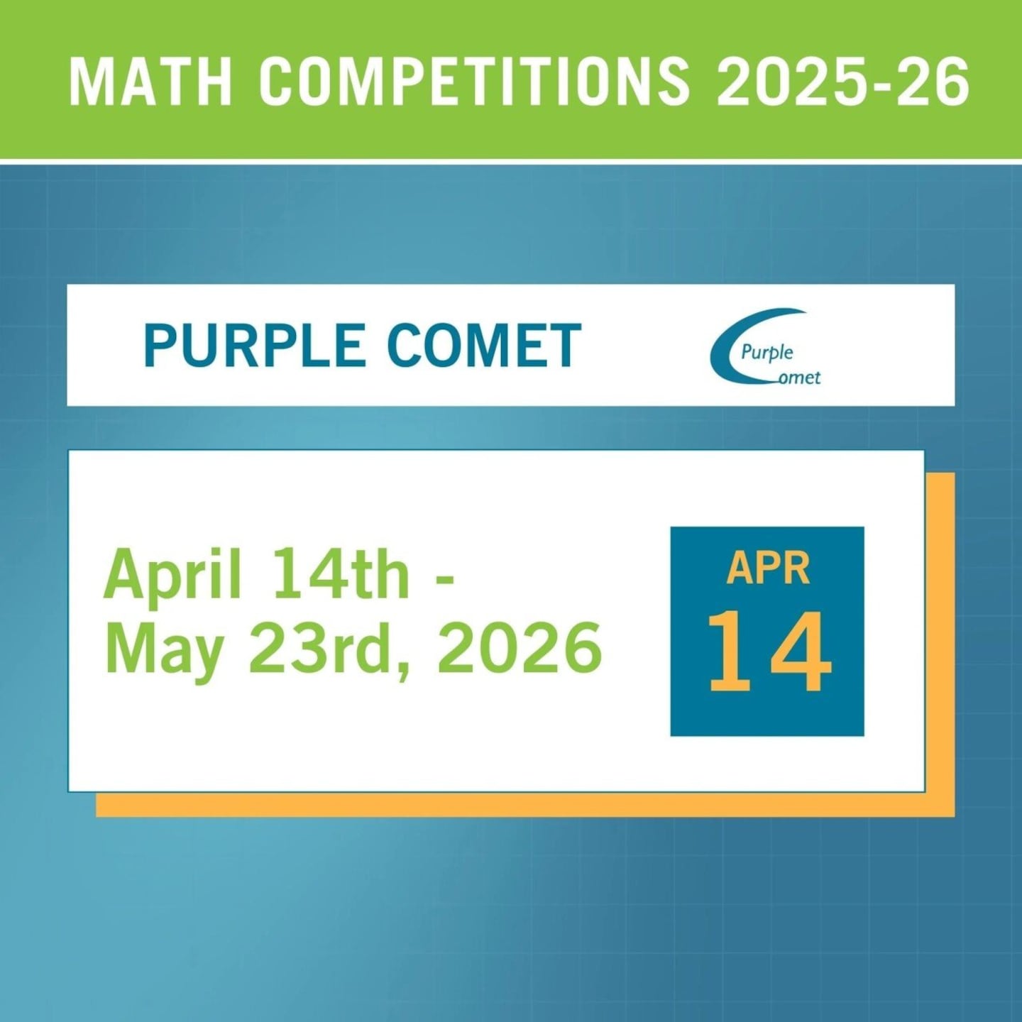 About the Contest: The Purple Comet! Math Meet is a free, annual, international, online, team mathematics competition designed for middle and high school students that has been held every year since 2003. Teams of from one to six students compete by submitting solutions to a list of mathematics problems. There is a ten-day window during which teams may compete, choosing a start time most convenient for them. The problems range in difficulty from fairly easy to extremely challenging.