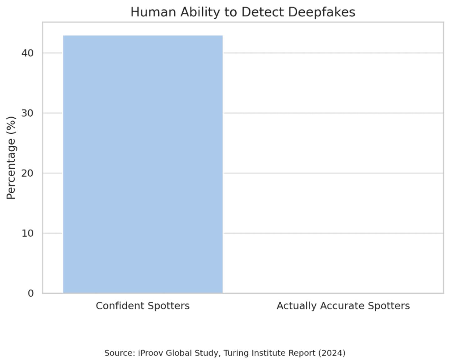 In practice, only 0.1% of participants accurately distinguished deepfakes from real images, videos, and audio content. In other words, those who felt the most certain about their detection skills were often the most easily deceived.