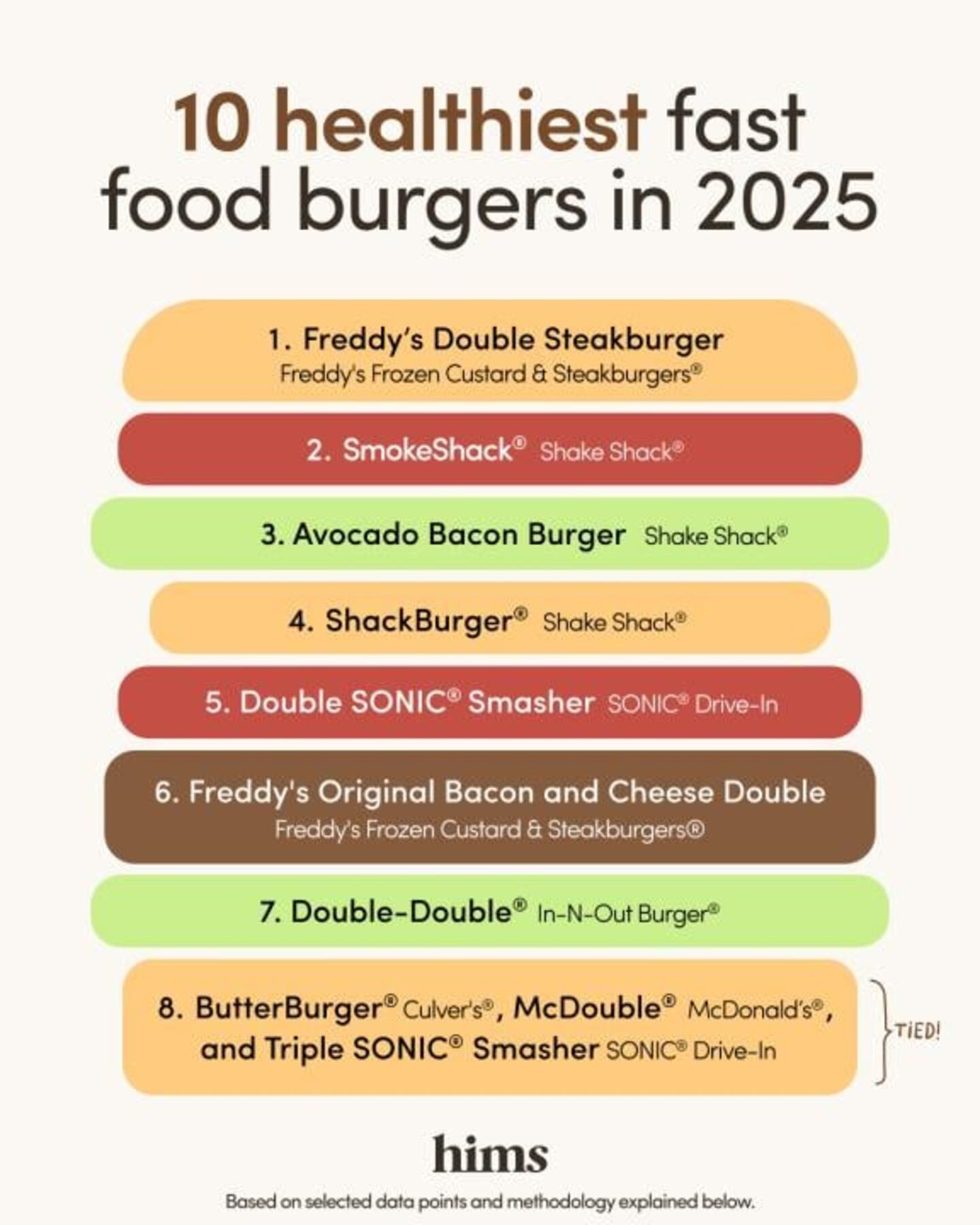 To determine the healthiest burgers in America, Hims evaluated menus from the country's top burger chains based on 2024 revenue. The fast food restaurants included in the analysis were McDonald's, Wendy's, Burger King, SONIC Drive-In, Jack in the Box, Whataburger, Culver's, Five Guys, Hardee's, Carl's Jr., In-N-Out Burger, Shake Shack, Checkers and Rally's, and Freddy's Frozen Custard & Steakburgers.
