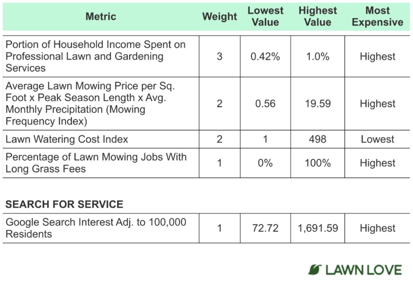 First, Lawn Love determined the factors (metrics) that are most relevant to rank the Cities Where Lawn Care Services Cost the Most Green in 2025. They then assigned a weight to each factor based on its importance and grouped those factors into two categories: Lawn Care Cost and Search for Service Providers. The categories, factors, and their weights are listed in the table below.