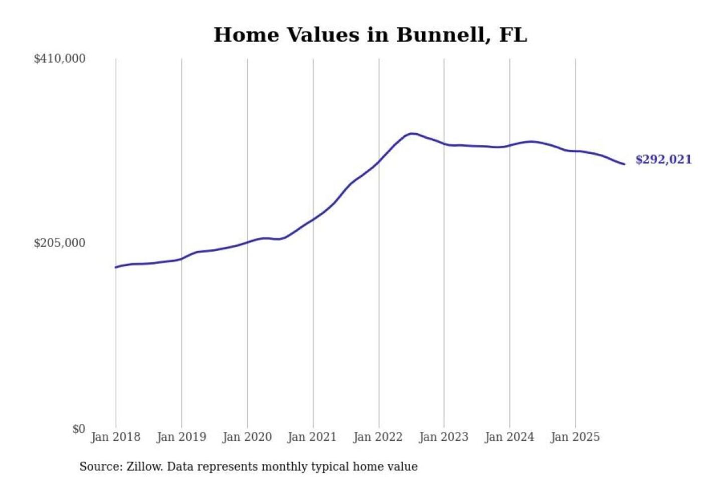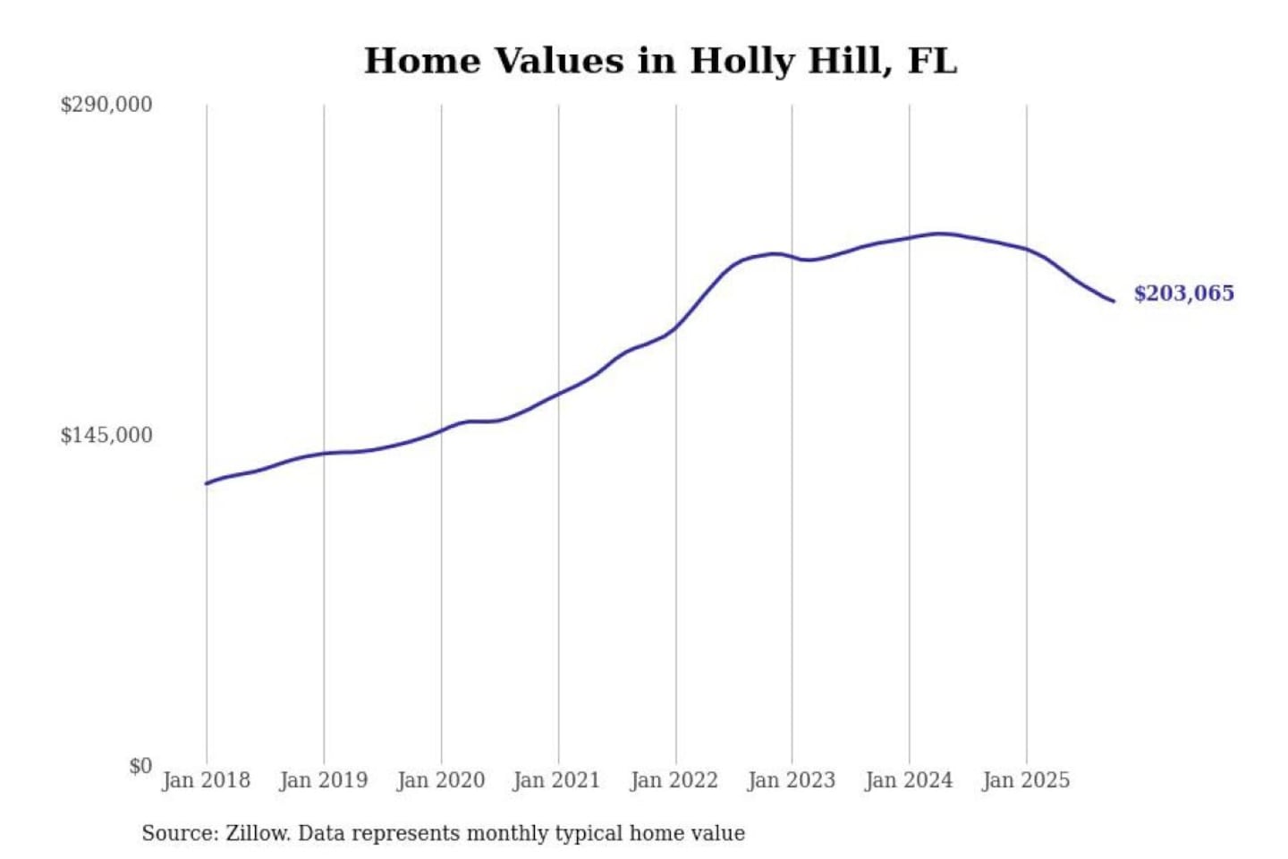 Stacker compiled a list of cities with the most expensive homes in the Deltona-Daytona Beach-Ormond Beach, FL metro area using data from Zillow. Charts show the monthly typical home value since January 2018.
