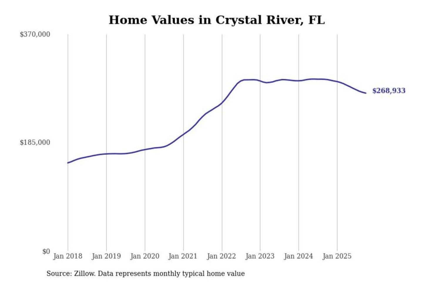 Stacker compiled a list of cities with the most expensive homes in the Homosassa Springs, FL metro area using data from Zillow. Charts show the monthly typical home value since January 2018.