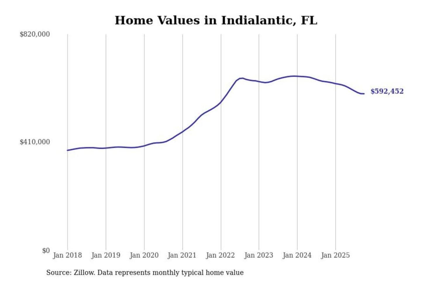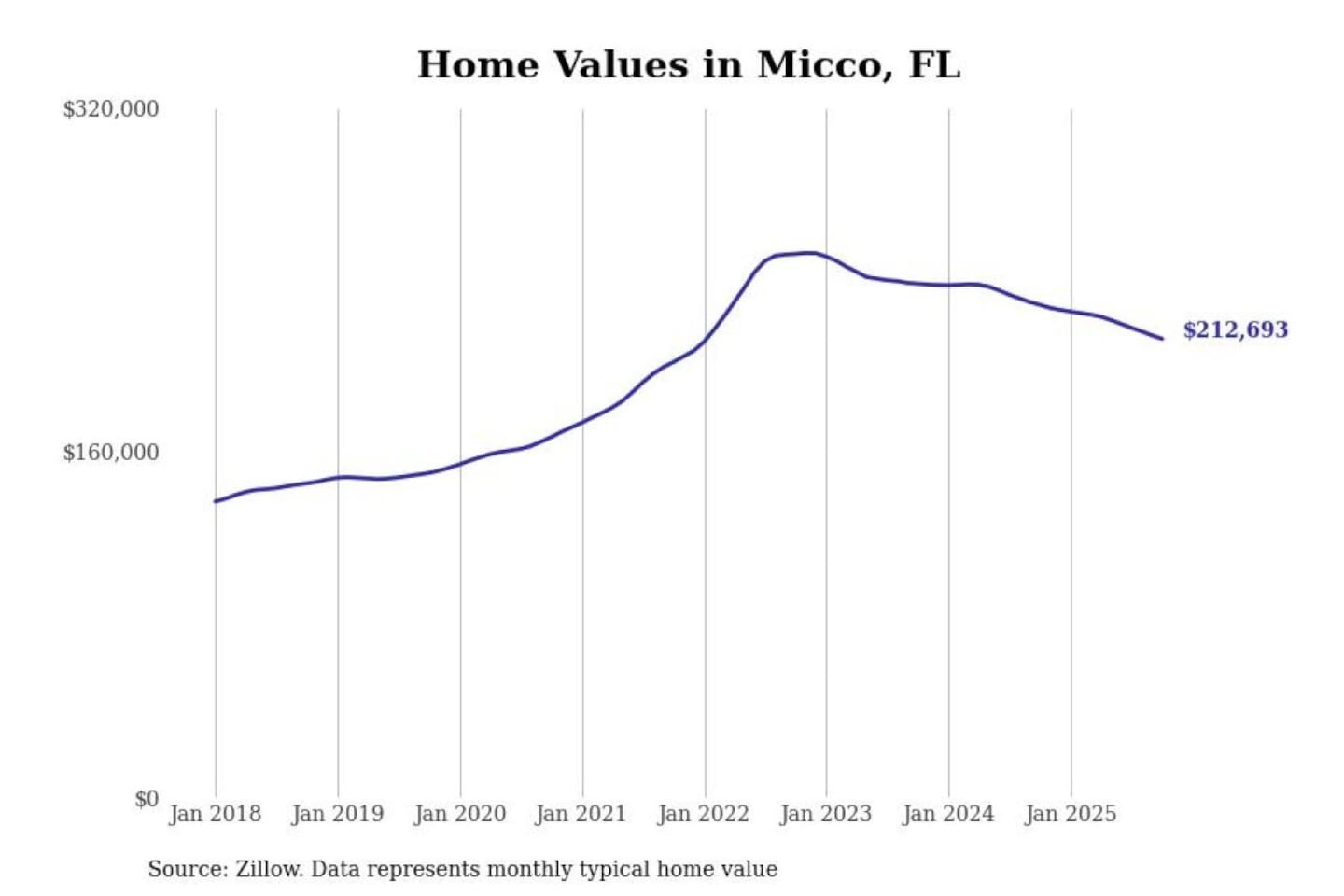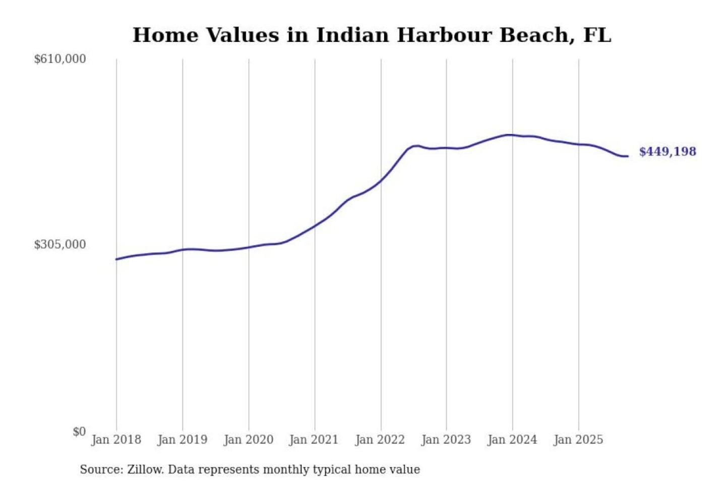 Stacker compiled a list of cities with the most expensive homes in the Palm Bay-Melbourne-Titusville, FL metro area using data from Zillow. Charts show the monthly typical home value since January 2018.