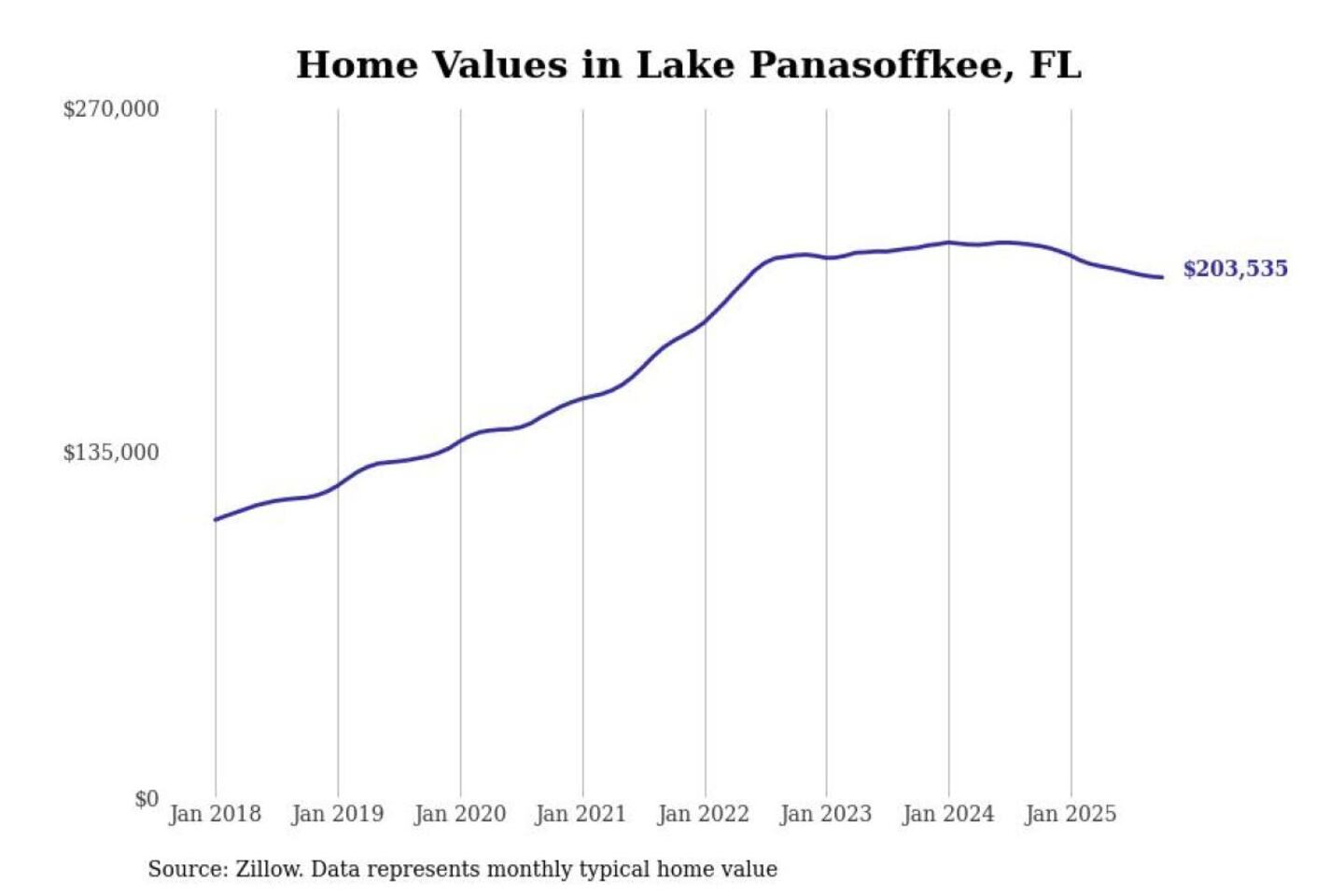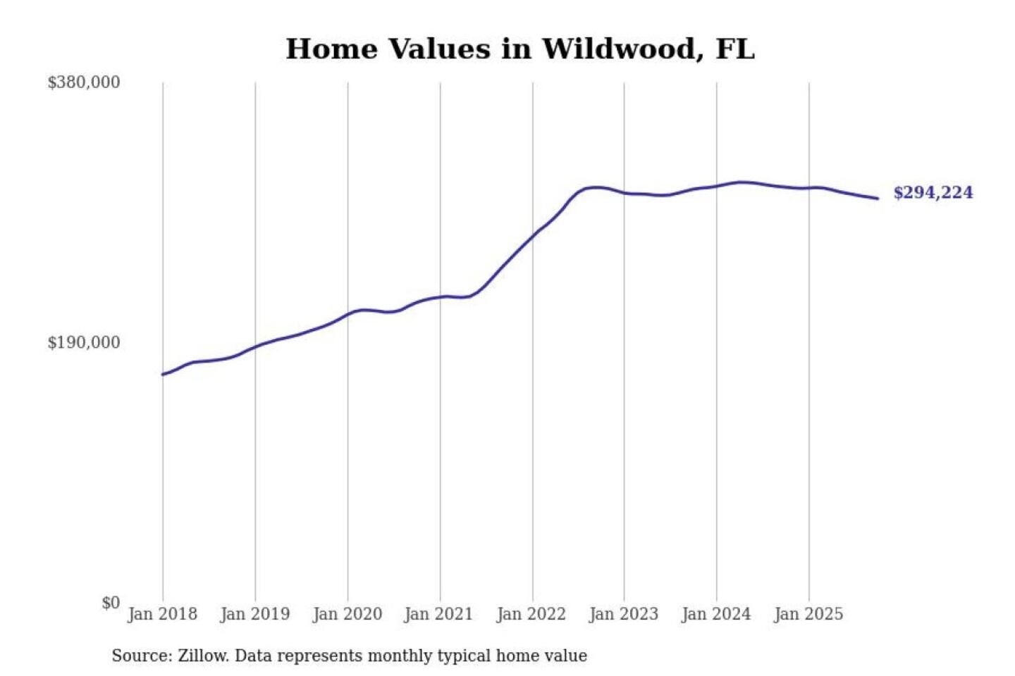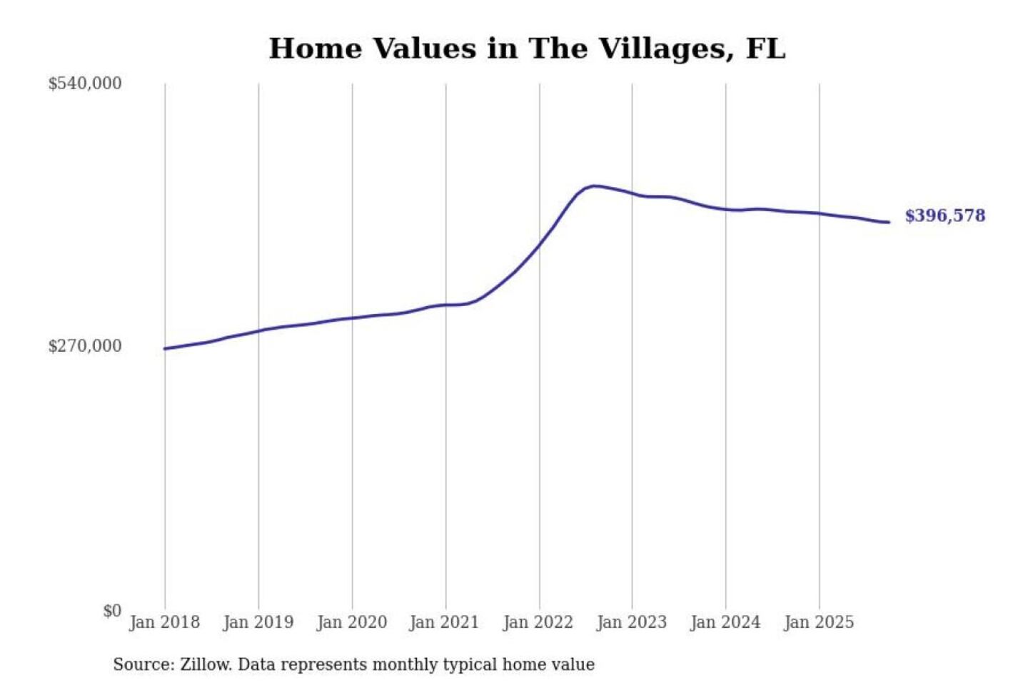 Stacker compiled a list of cities with the most expensive homes in the The Villages, FL metro area using data from Zillow. Charts show the monthly typical home value since January 2018.
