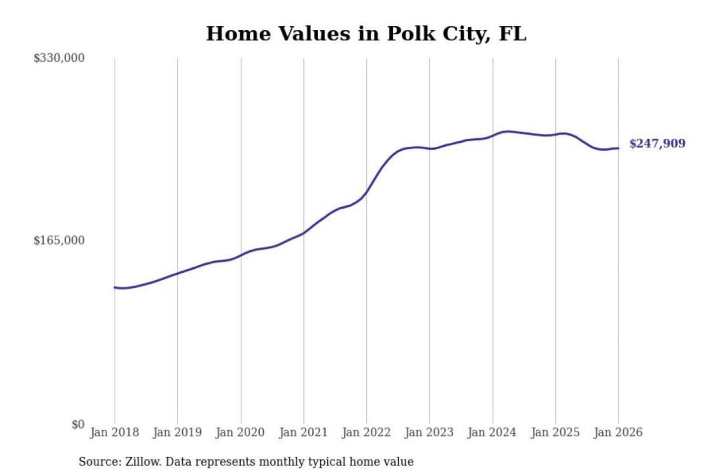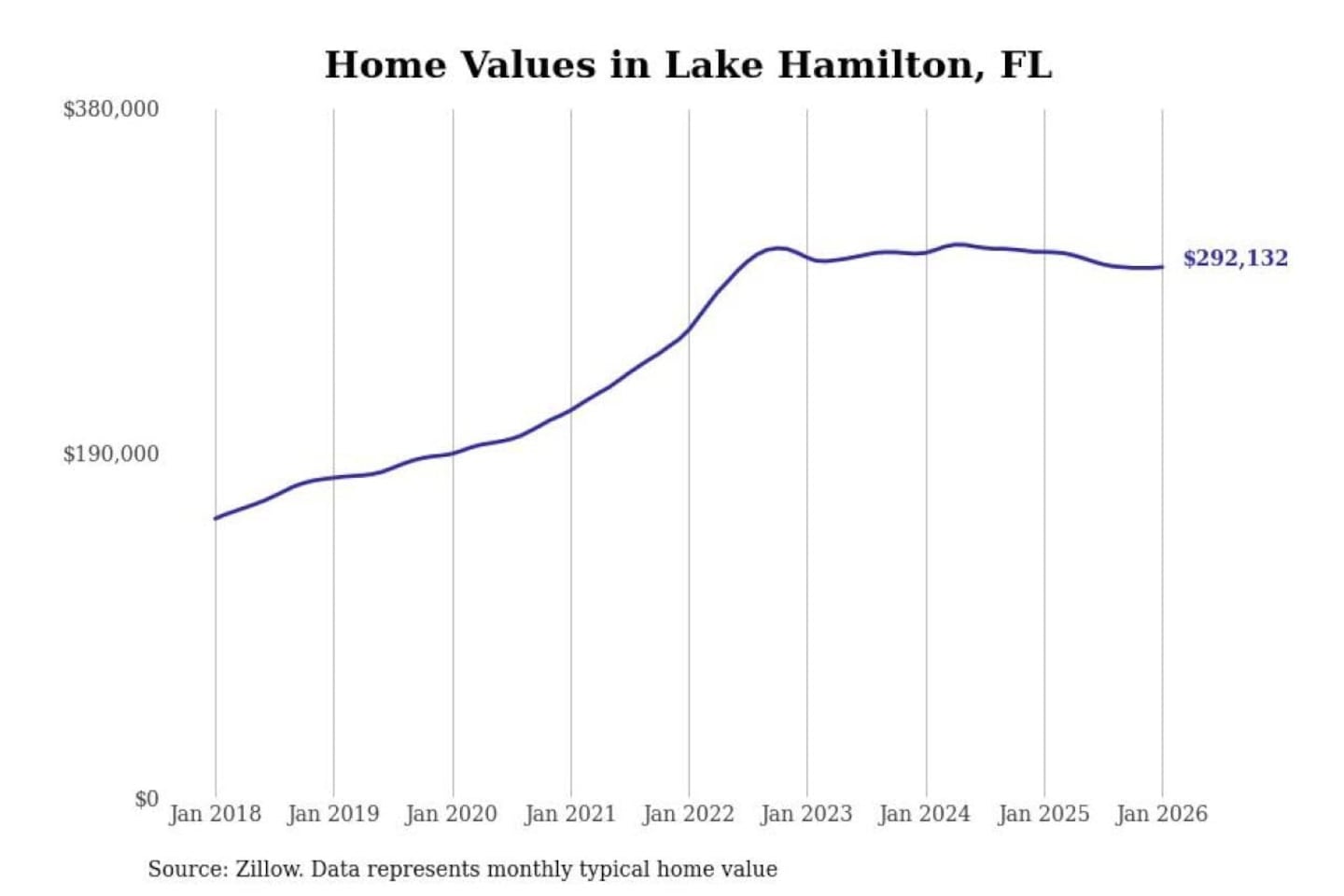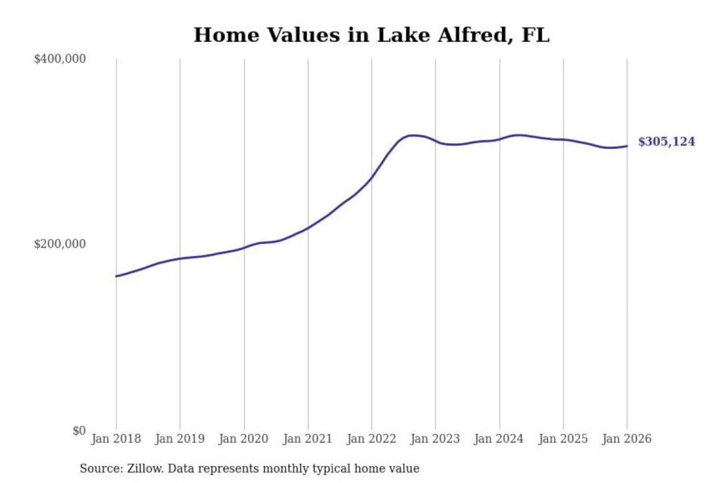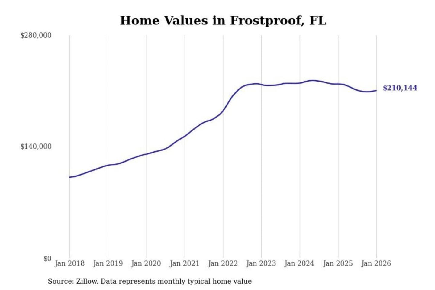 Stacker compiled a list of cities with the most expensive homes in the Lakeland-Winter Haven, FL metro area using data from Zillow. Charts show the monthly typical home value since January 2018.