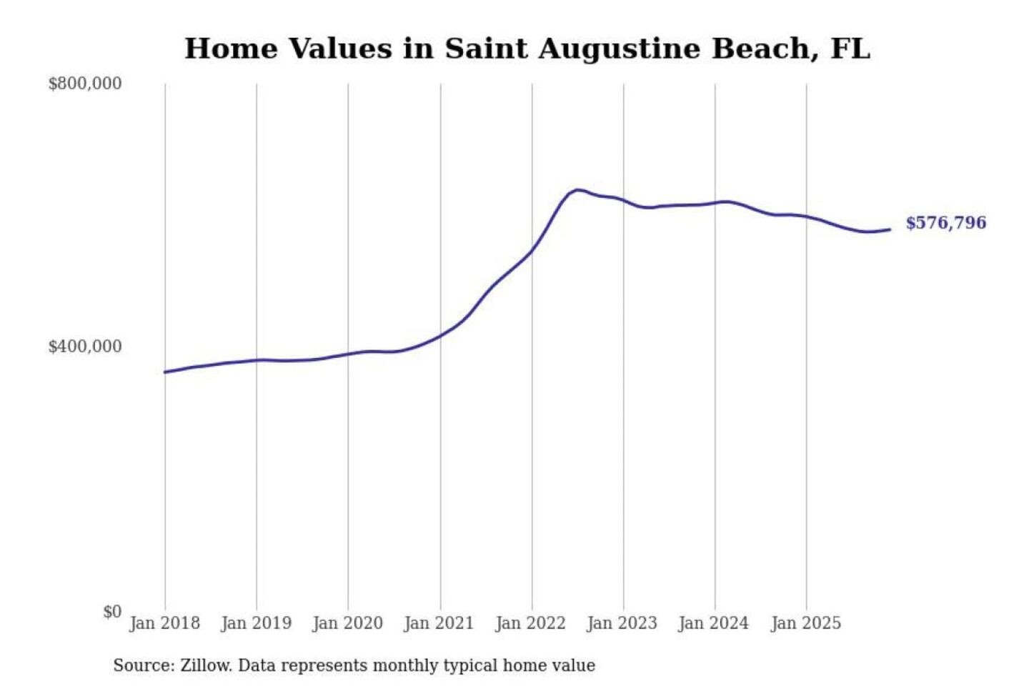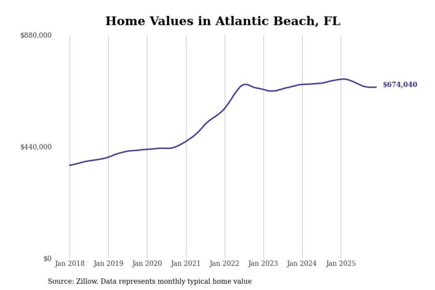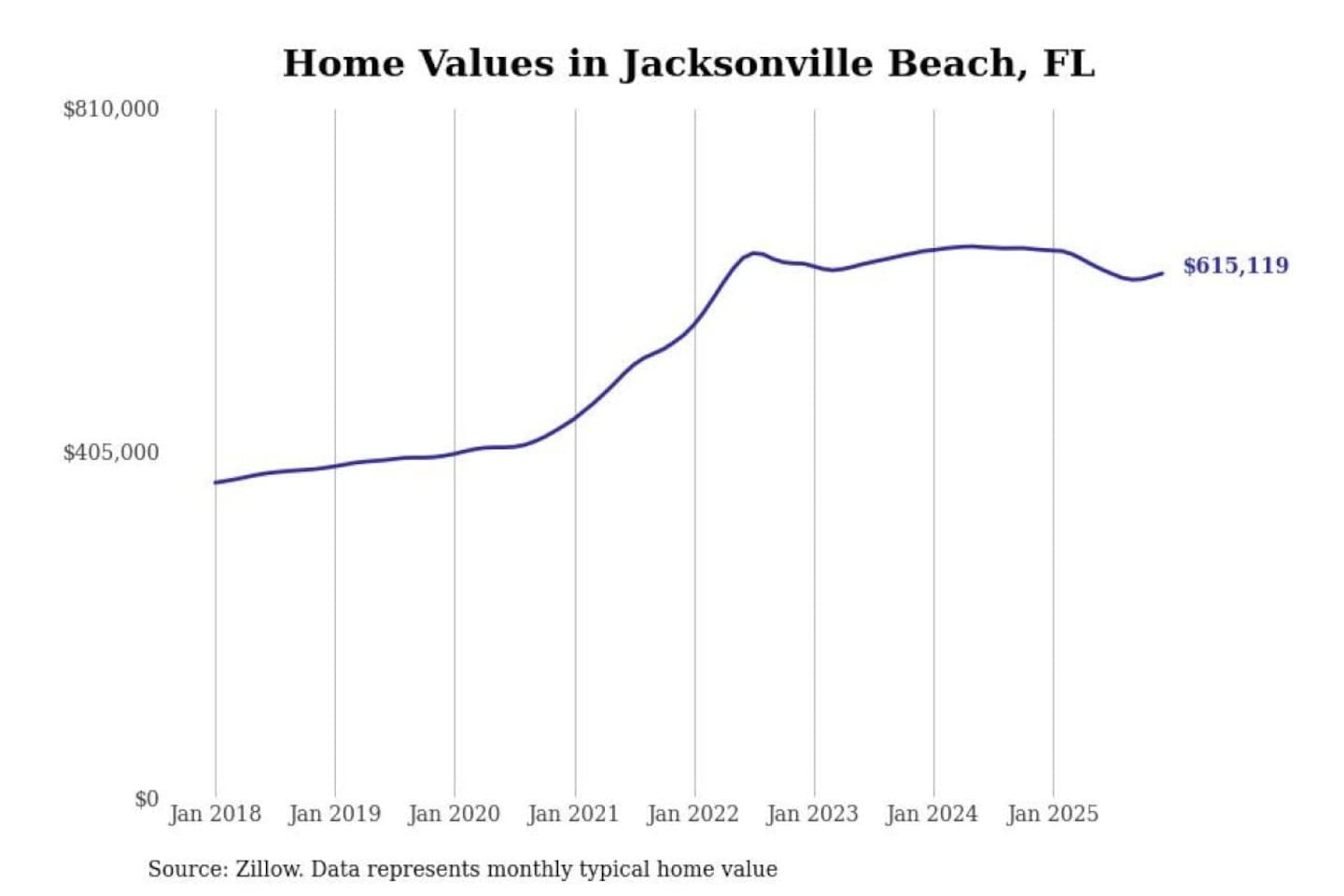 Stacker compiled a list of cities with the most expensive homes in the Jacksonville, FL metro area using data from Zillow. Charts show the monthly typical home value since January 2018.