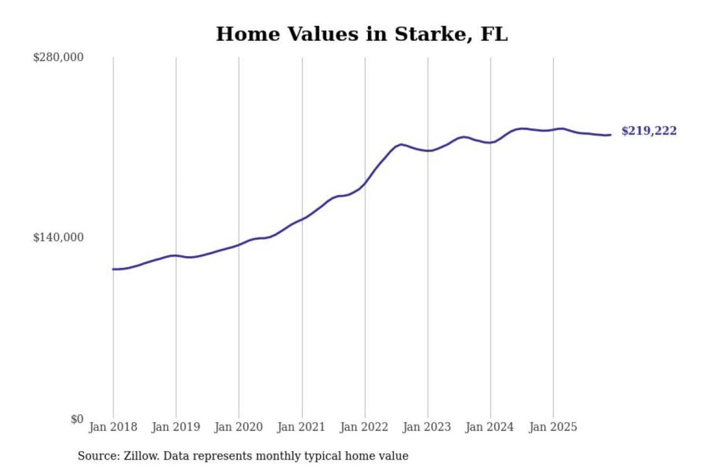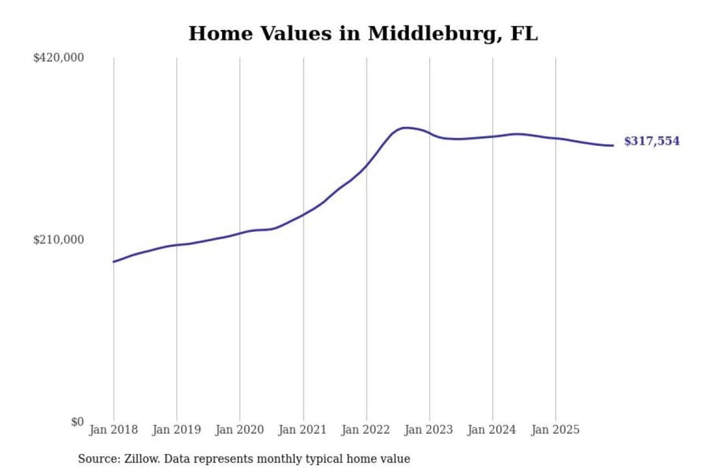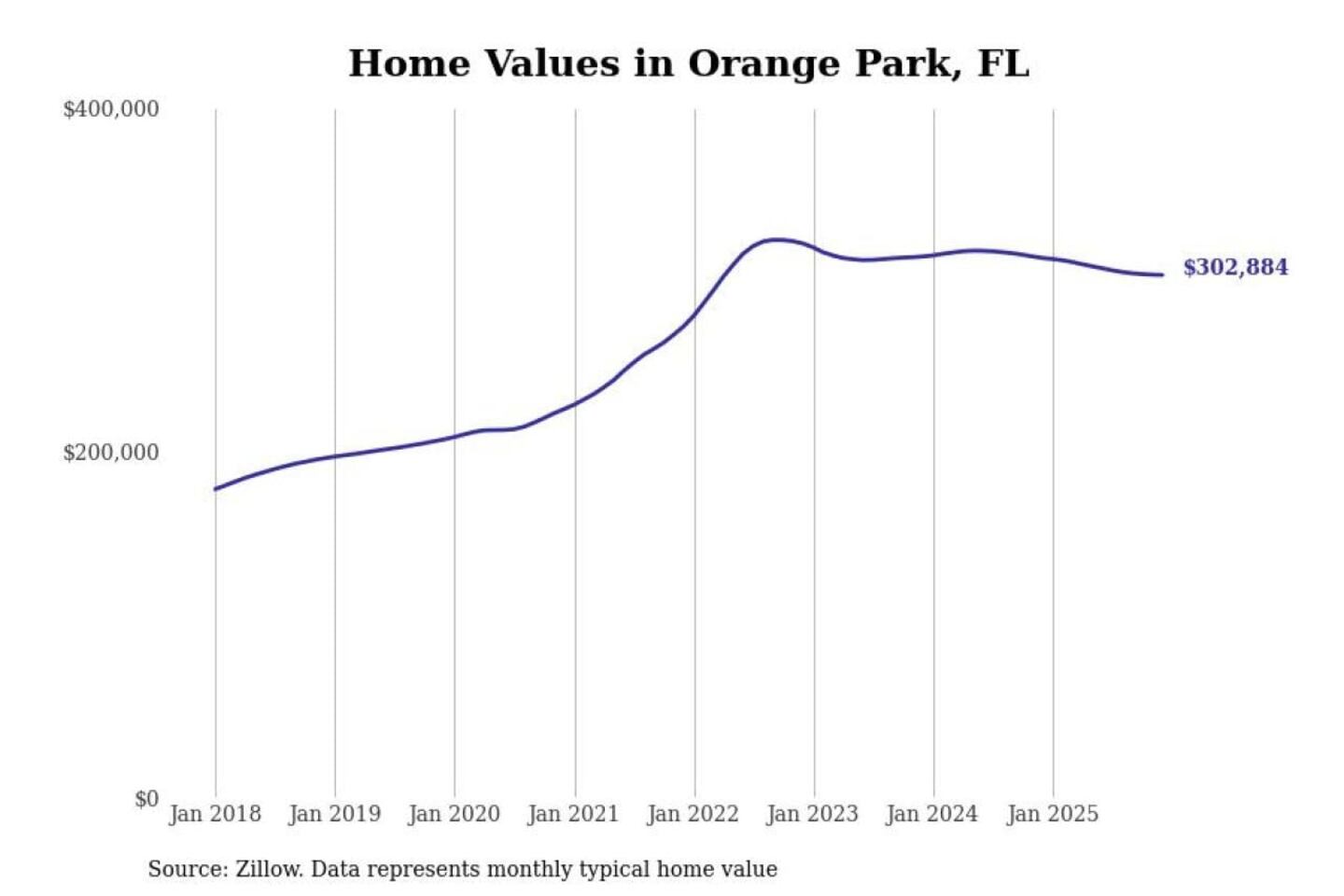 Stacker compiled a list of cities with the most expensive homes in the Jacksonville, FL metro area using data from Zillow. Charts show the monthly typical home value since January 2018.