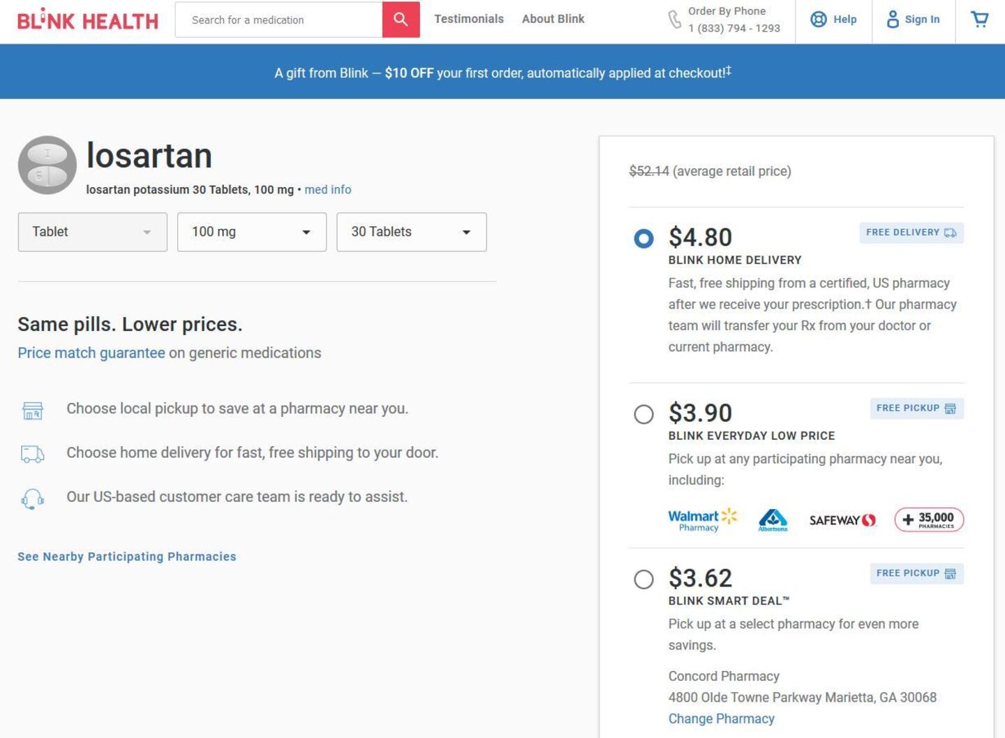 Here's an example from the Blink website about how pricing would work for one common medication upon refill: