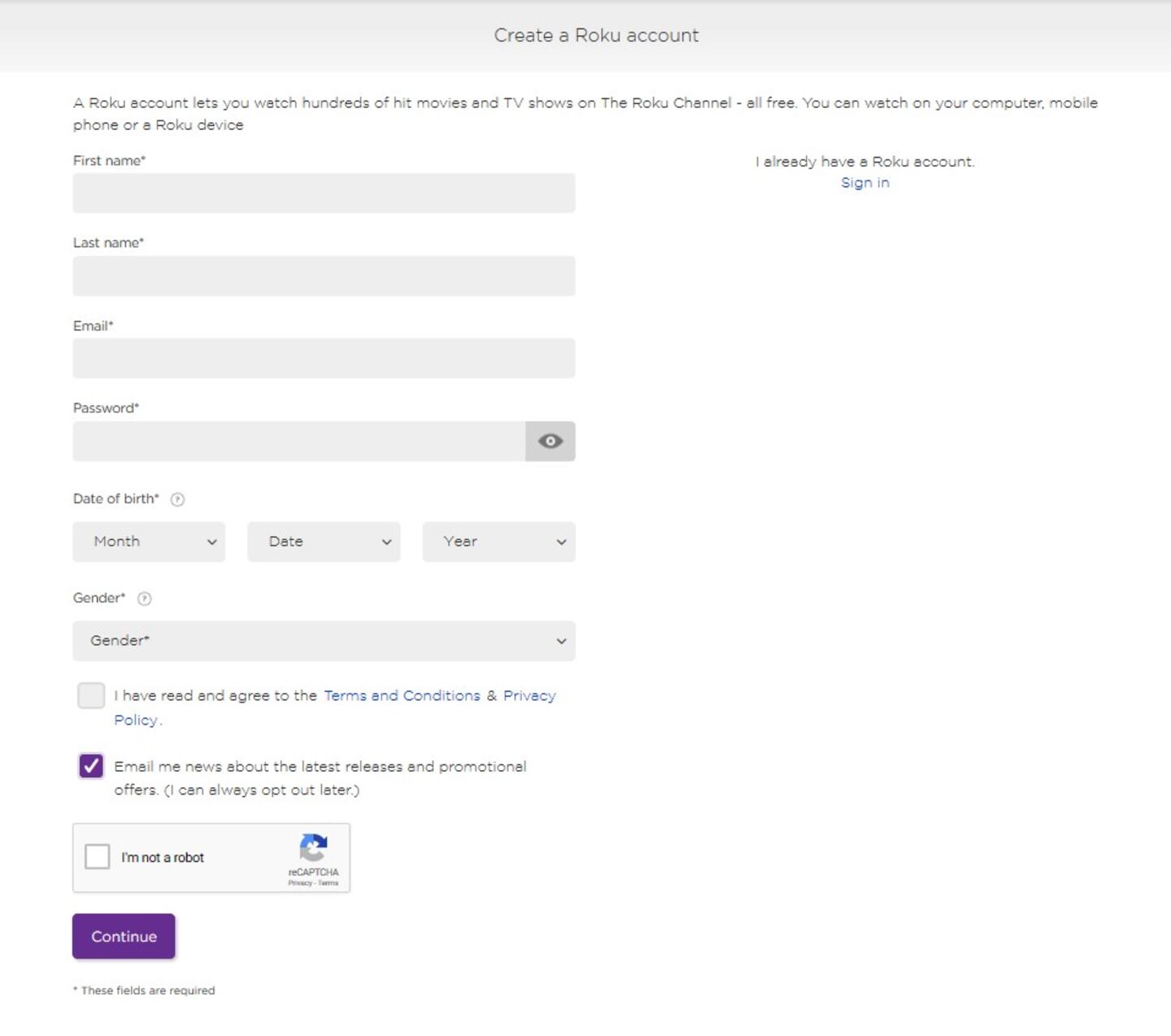 You can signup for a Roku account via your Roku device, or you can set one up without a device on Roku’s official website. Here’s a quick look at the type of information (name, email address, date of birth, etc.) that is required for signup: