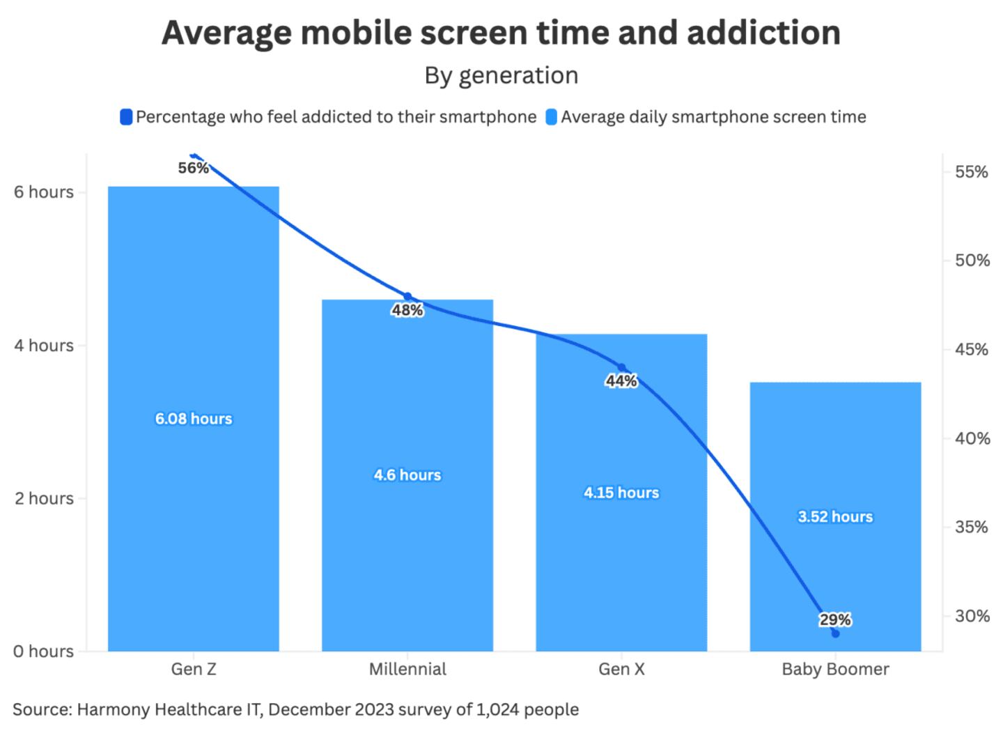 Younger generations lead the charge. A Harmony Healthcare IT survey conducted in January 2023 found that Gen Z averages over six hours daily on their phones, and 56% say they feel addicted. Including other screens, Gen Z clocks more than seven hours daily. Millennials follow at over 4.6 hours, with nearly half feeling addicted. Gen X hits 4 hours and some change, and Boomers trail at just under 4 hours.