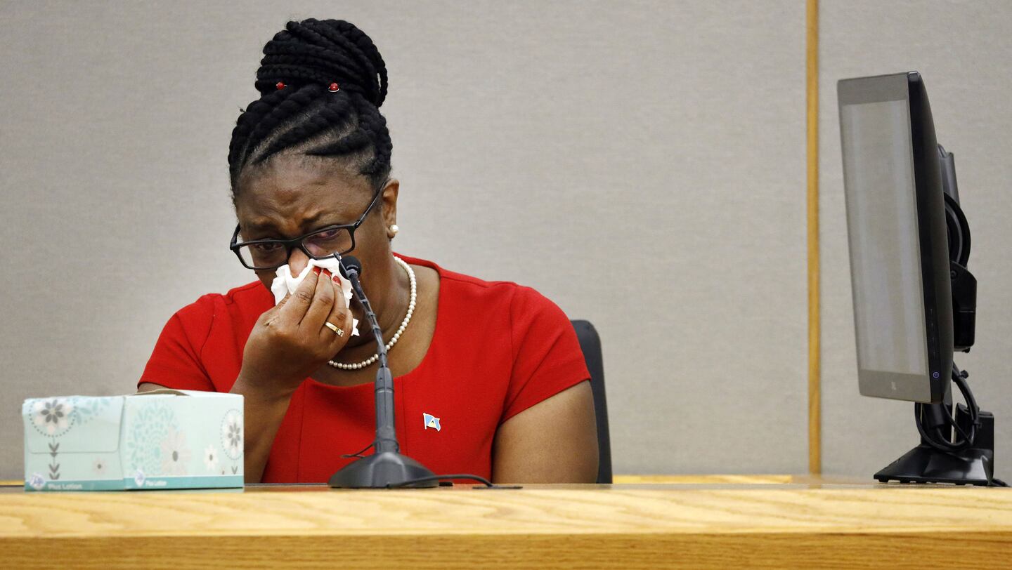 Allison Jean weeps as she testifies Tuesday, Oct. 1, 2019, about her son, Botham Jean, who was gunned down in September 2018 by his neighbor, Amber Guyger, who was a Dallas police officer at the time. Guyger was convicted Tuesday of murder.