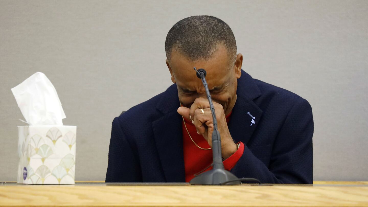 Bertrum Jean, father of victim Botham Jean, weeps as he testifies Wednesday, Oct. 2, 2019, in the penalty phase of ex-Dallas cop Amber Guyger's murder trial. Guyger, 31, was convicted of killing Jean, her upstairs neighbor, in September 2018.