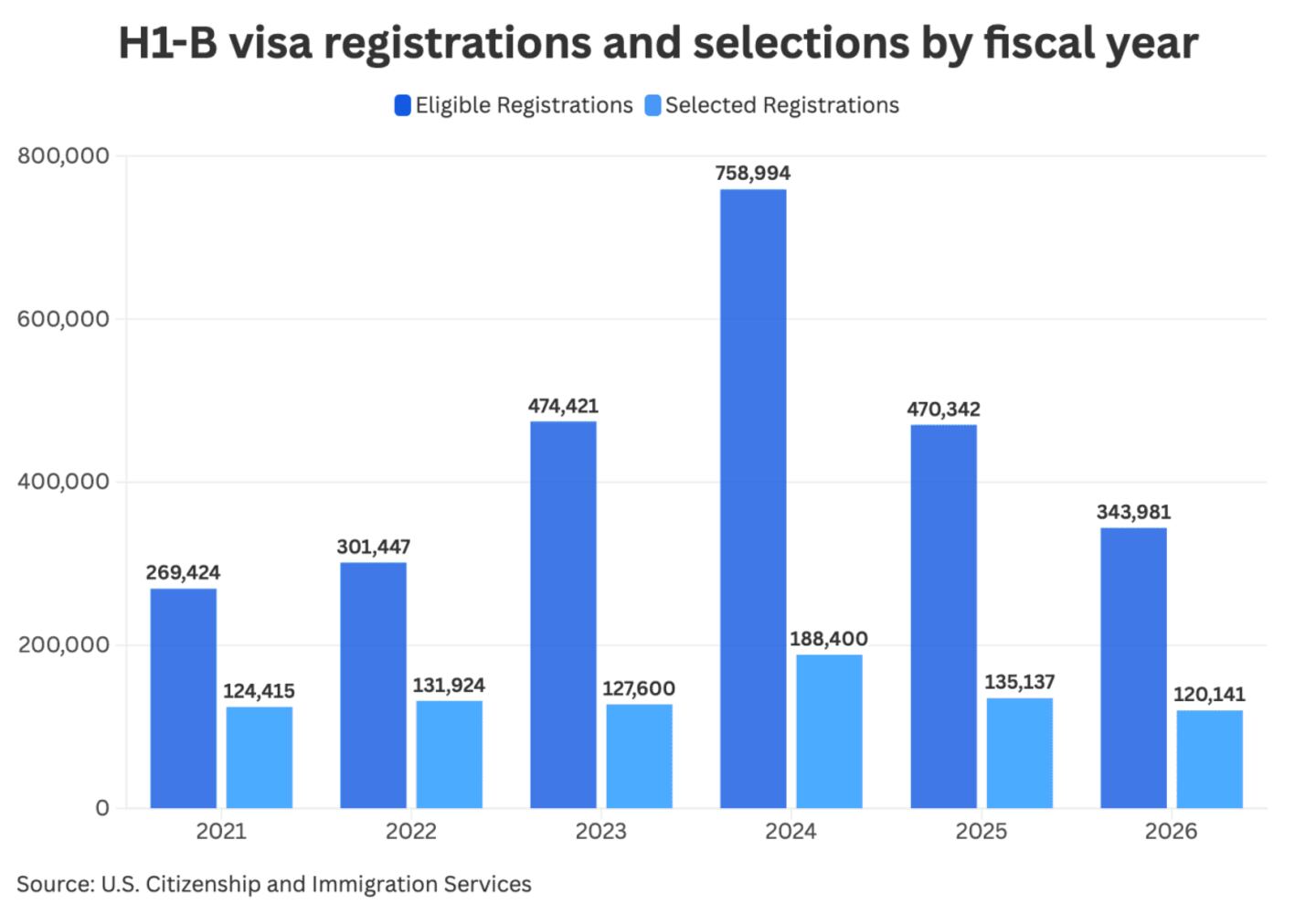 According to USCIS data, the average number of registrations per applicant dropped from 1.70 in fiscal year 2024 to just 1.06 in 2025. Total eligible registrations also declined by over 38%, from 758,994 to 470,342.