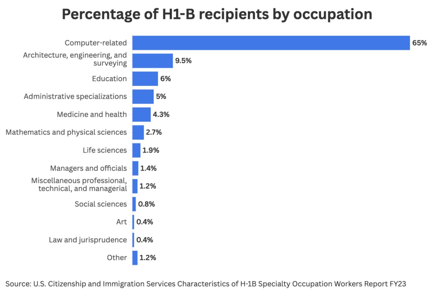 The H-1B is deeply tied to the tech economy. In FY 2023, about 65% of all H-1B approvals were for computer-related occupations, with smaller shares in: