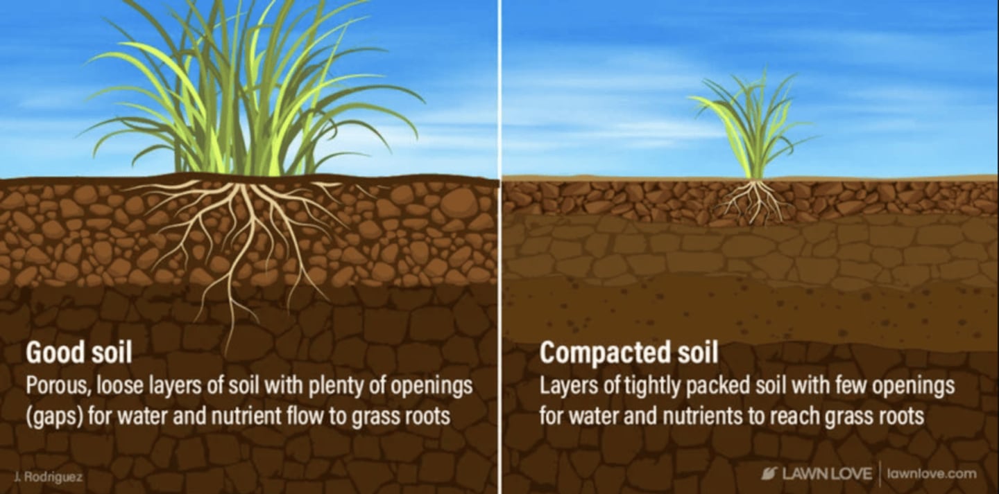 Fix compacted soil by aerating annually for clay soil or every three years for sandy or loamy soil. Aeration creates tiny holes that allow oxygen, water, and nutrients to reach the roots.