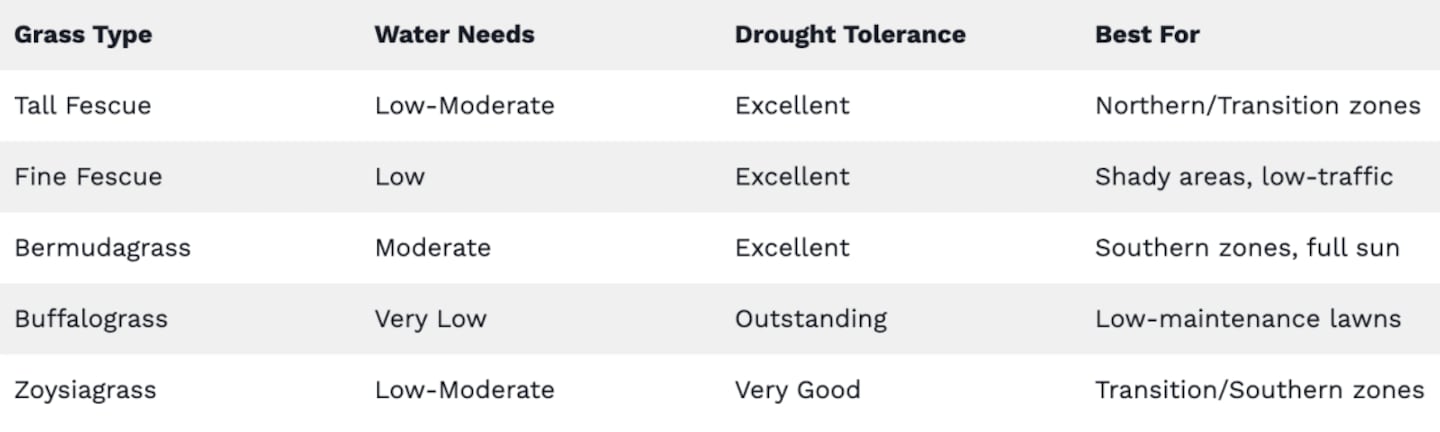 • Drought-tolerant grasses like tall fescue and Bermuda grass need significantly less water than traditional varieties.