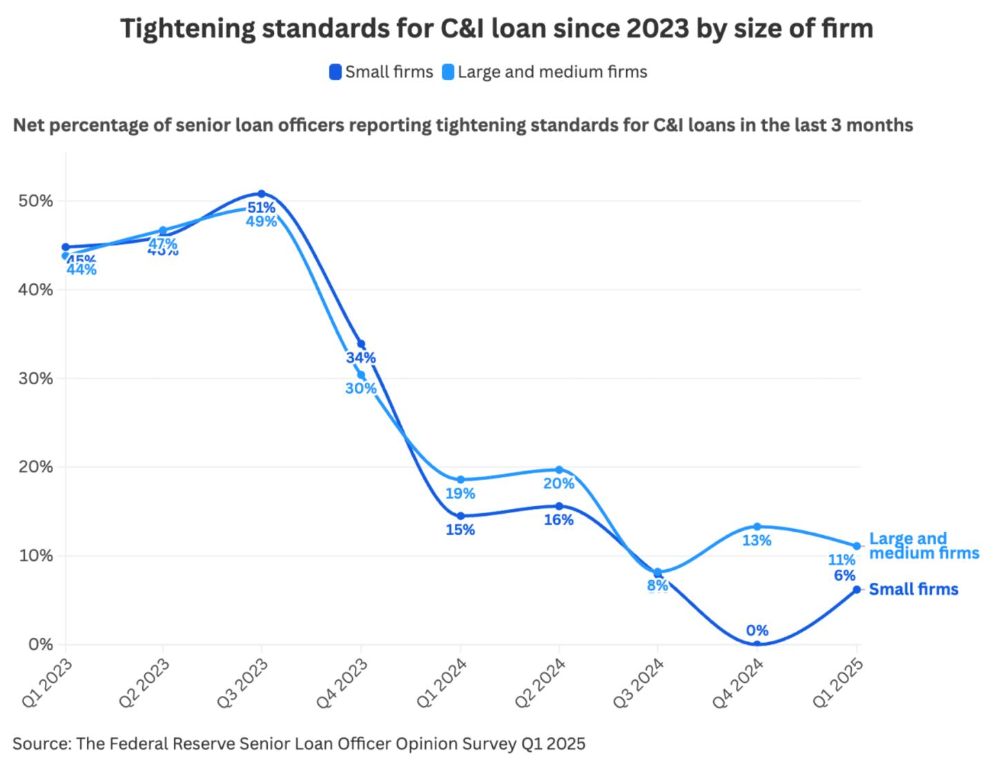 The Federal Reserve's Senior Loan Officer Opinion Survey from Q1 in 2025 suggests that it has become more challenging for small businesses in the United States to secure commercial and industrial loans. As economic uncertainty rises, banks are becoming more hesitant to lend money to low-collateral businesses.