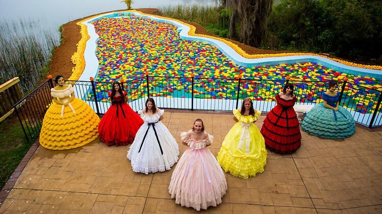 Former Cypress Gardens southern belles in their billowing dresses and the LEGO belles, now iconic in the gardens, greeted guests to the event. The Florida Pool was filled with brightly-colored floating LEGO brick and the perimeter was adorned with fresh Florida citrus, paying homage to the iconic citrus photos made famous by Dick Pope, Sr. during the mid-1900s.