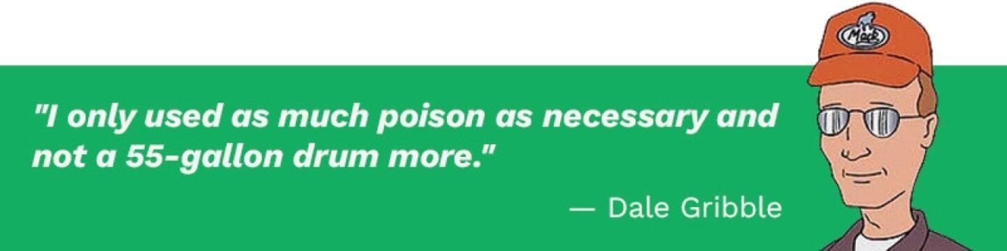 As Dale, self-proclaimed exterminator extraordinaire, reassured him: “I only used as much poison as necessary and not a 55-gallon drum more.”