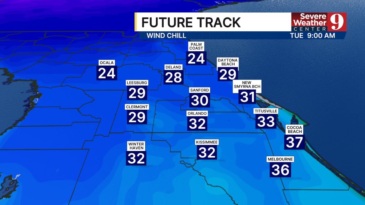 In Central Florida, the biggest factor for us will be the wind chill. Temperatures in Orlando may stop between 37° and 39°, but it will feel closer to freezing when you factor in the wind.