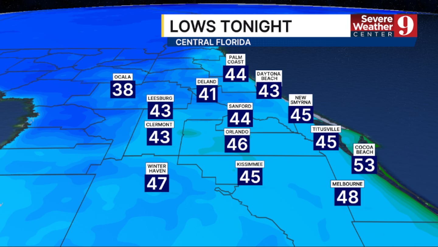Mostly clear skies are expected tonight, allowing temps to fall quickly. Morning lows will be in the mid-40s, with 30s likely northwest of Orlando. Some patchy frost is also possible in far northwest areas toward daybreak.