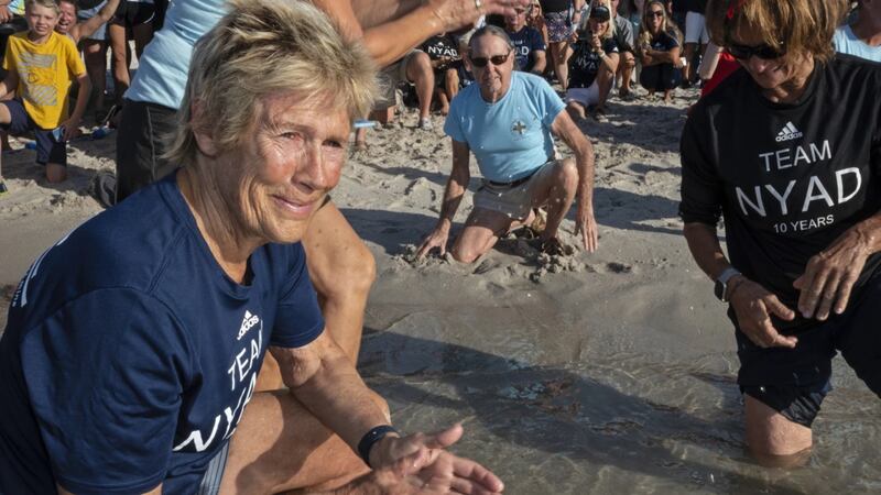 Nyad and her Cuba swim expedition leader Bonnie Stoll helped return “Rocky,” a 120-pound female green sea turtle, to the Atlantic Ocean at Key West’s Smathers Beach as they marked the anniversary with her former support team.