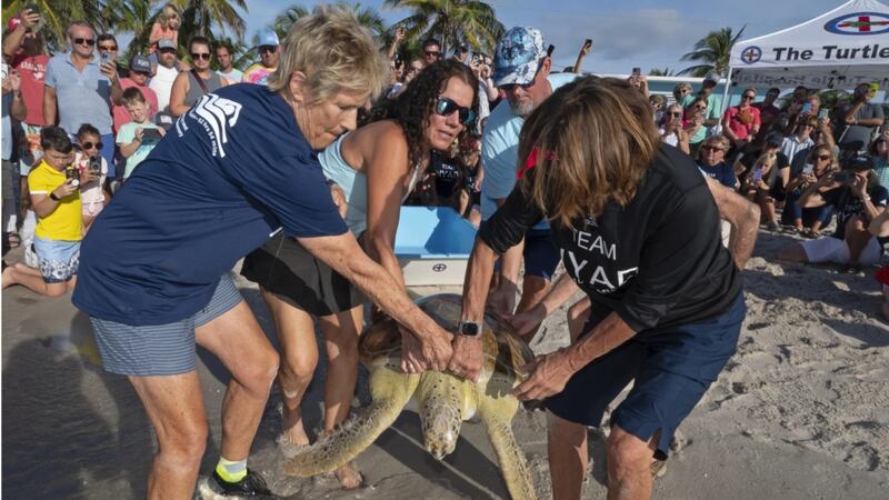 She joined personnel from the Turtle Hospital to carry Rocky across the sand on Sunday to the water’s edge.