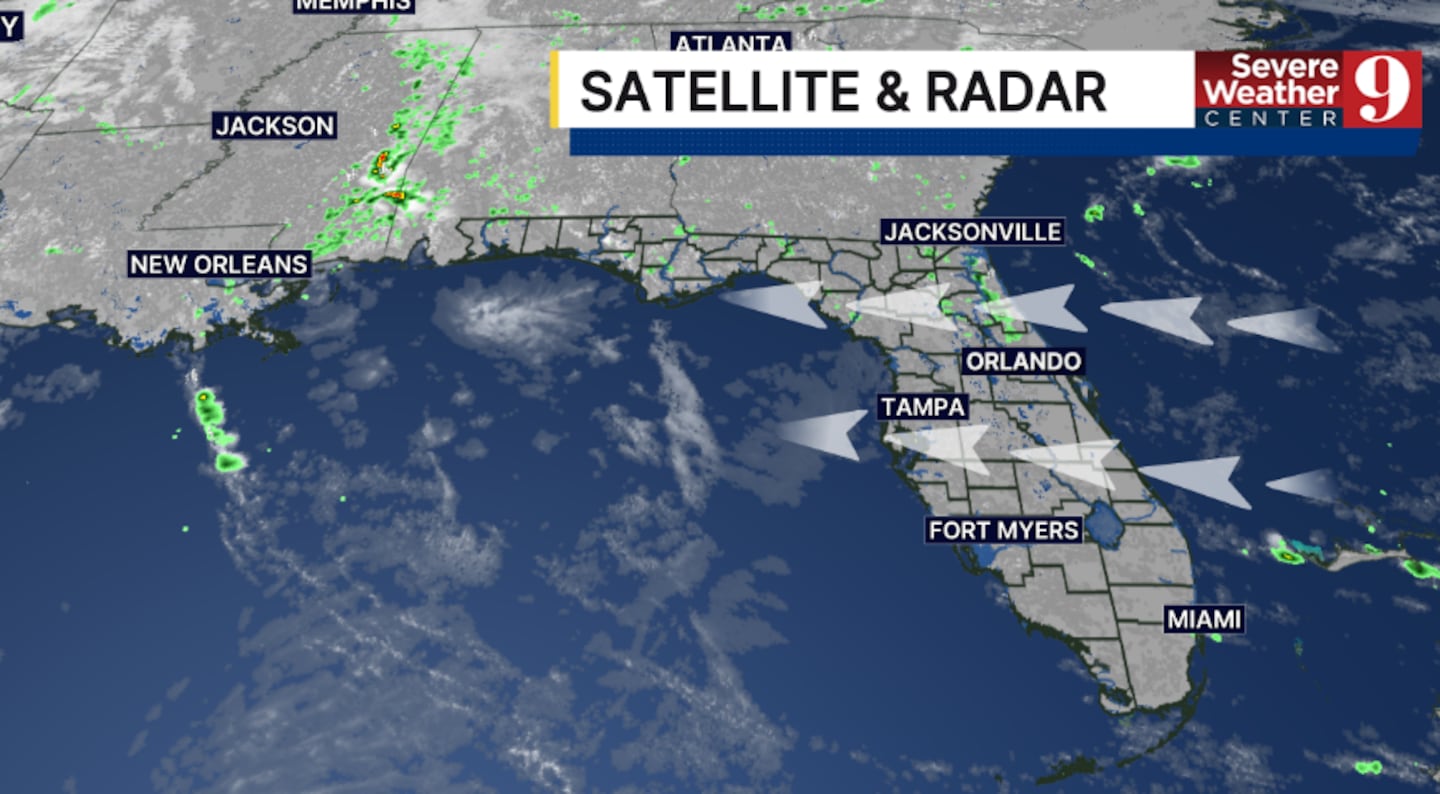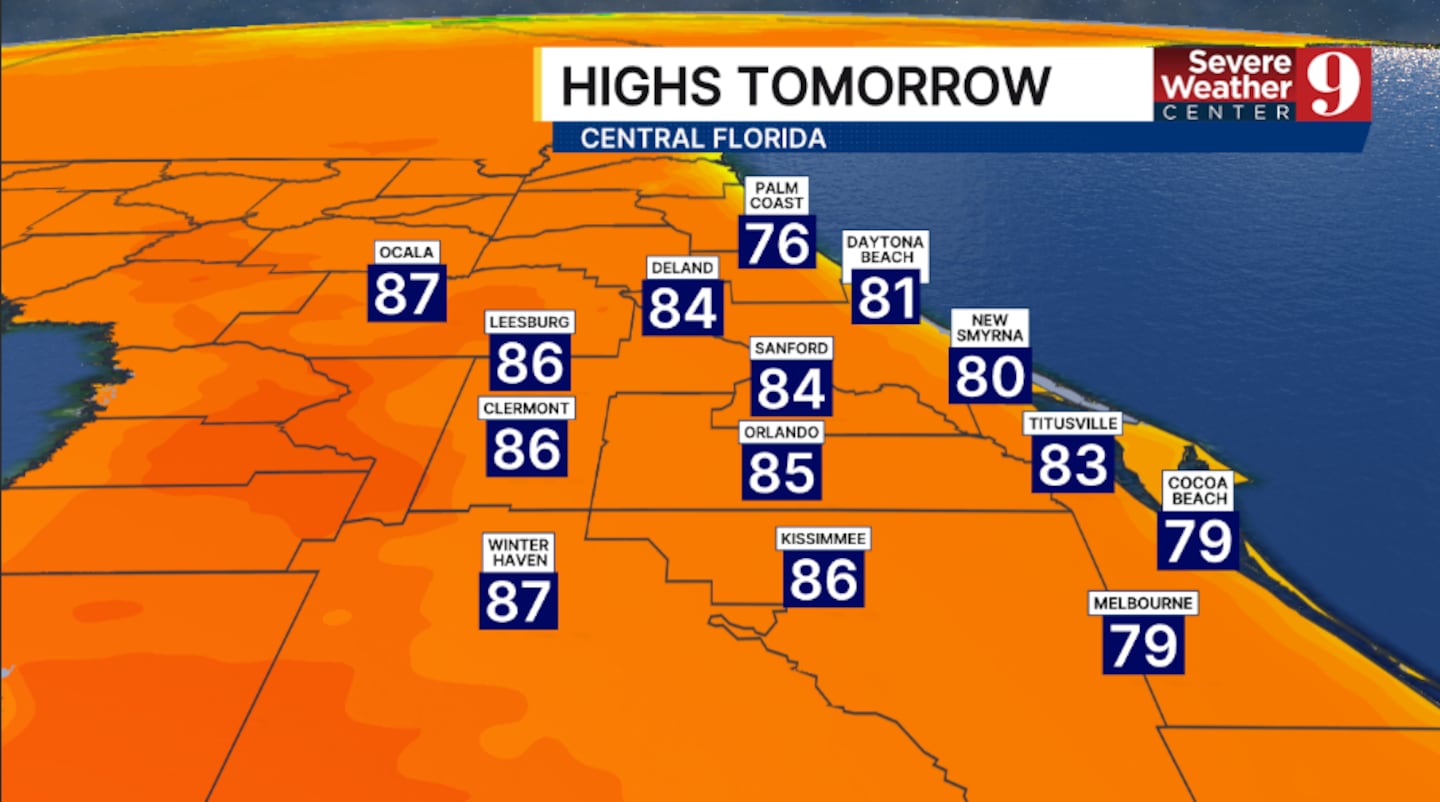 Scattered showers are likely on Saturday. The best chance for activity will be along and west of the I-4 corridor, with warm highs in the mid-80s.
