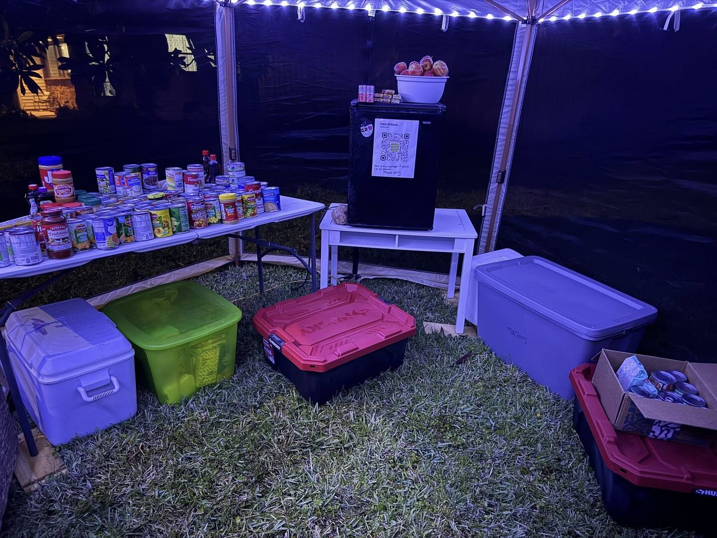 The pantry operates under a tent with lights, and Williams ensures that perishable items are stored in a small fridge. She moves most items inside at night, except for canned goods and some plastic items.
