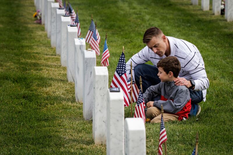 Memorial Day 2023: Brad Fromm talks to his son, Tyler, at the final resting place of a fallen loved one in Arlington National Cemetery on Memorial Day. (Samuel Corum/Getty Images)