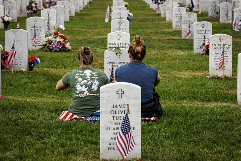 Memorial Day 2023: Two women visit a fallen loved one at Arlington National Cemetery on Memorial Day. (Samuel Corum/Getty Images)