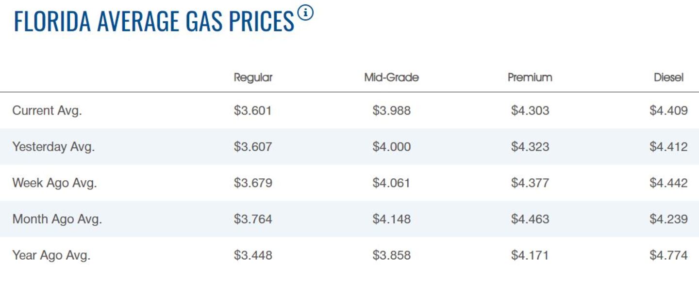 On Sunday, Floridians paid an average of $3.61 for a gallon of regular unleaded fuel.