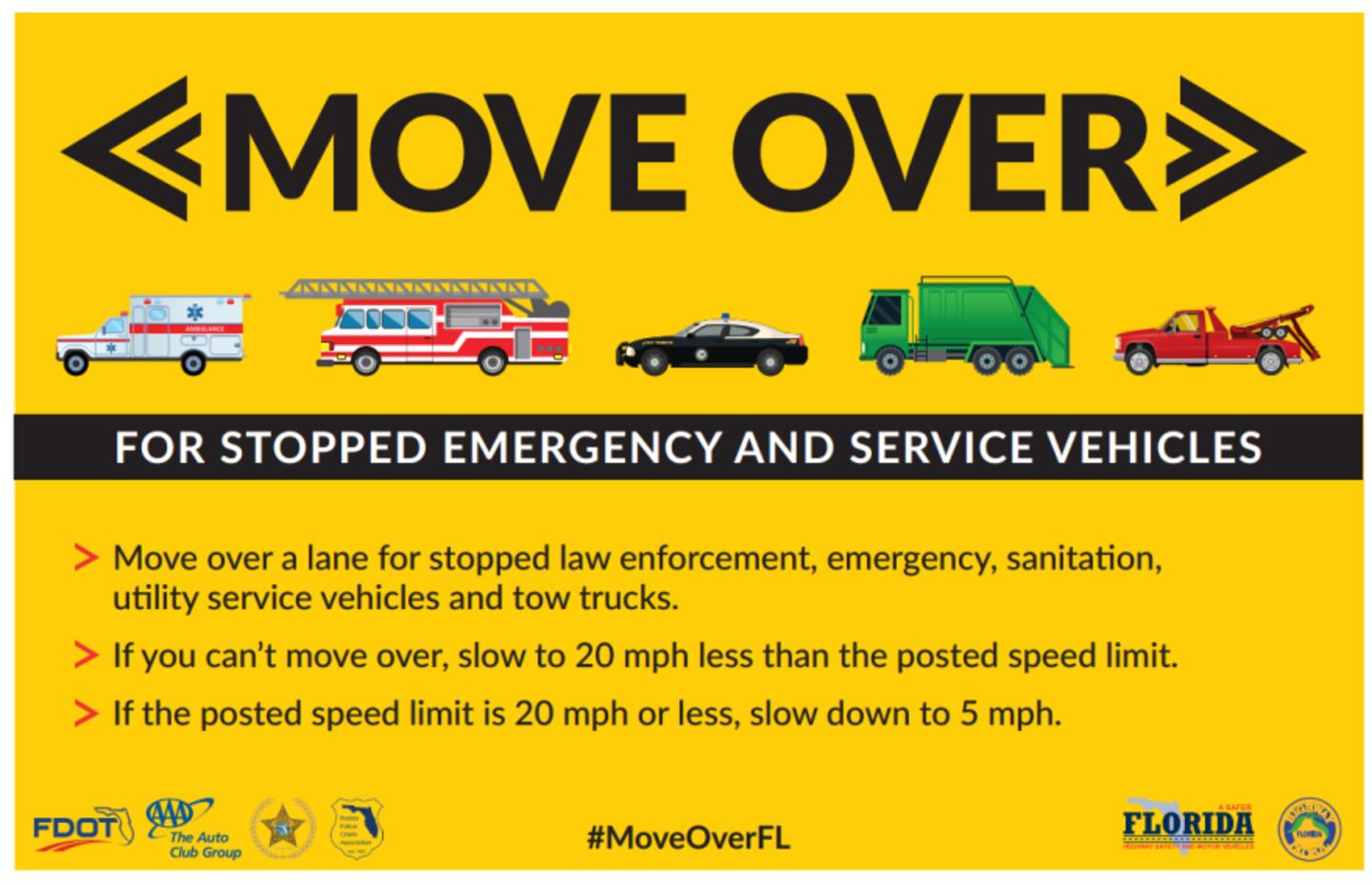 According to a news release, moving over gives law enforcement, emergency first responders, and other service vehicles a safe space to do their jobs and the law significantly increases the safety of Florida roadways.