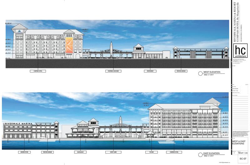 The proposed Margaritaville Marina and Riverwalk will consist of a seven-story, 146-room hotel, restaurant, a 221-slip marina and event lawn.