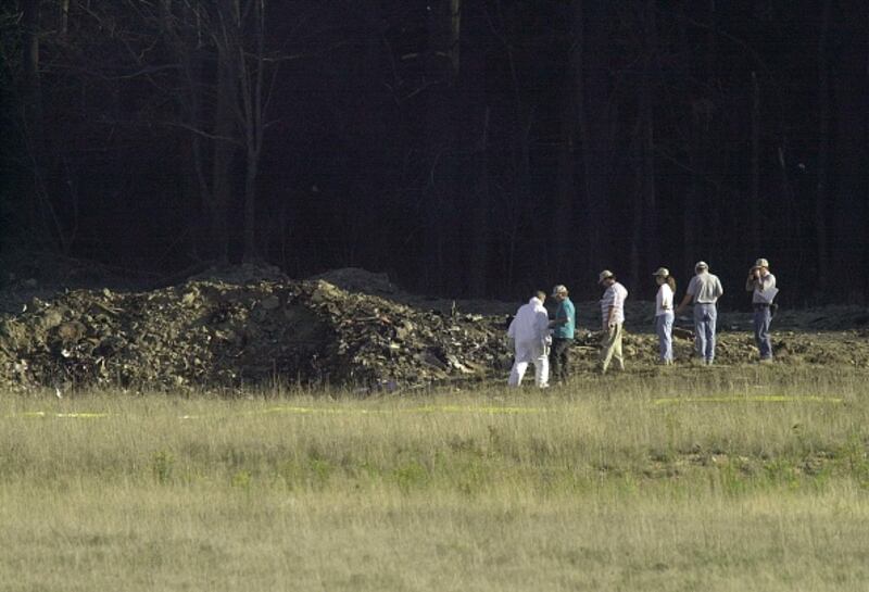 Remembering 9/11 Officials examine the crater 11 September 2001 at the crash site of United Airlines Flight 93 in Shanksville, Pennsylvania. The plane from Newark, New Jersey, and bound for San Francisco, California, is believed to have been hijacked and crashed in the field killing all on board. AFP PHOTO/David MAXWELL (Photo credit should read DAVID MAXWELL/AFP via Getty Images) (DAVID MAXWELL/AFP via Getty Images)