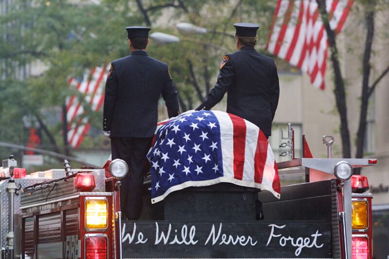 Remembering 9/11 Firefighters stand atop a fire engine with the flag-draped casket of fellow fireman Lt. Dennis Mojica September 21, 2001 during a funeral service at St. Patrick's Cathedral in New York City. Mojica, who was with Rescue Company 1, is one of nearly 300 firefighters who lost their lives in the World Trade Center disaster. (Photo by Joe Raedle/Gettyimages) (Joe Raedle/Getty Images)
