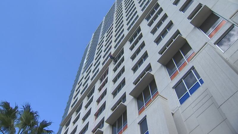 ORLANDO, Fla. — Dozens of people strapped in and donned their helmets to take a 26-story trip down the outside of an Orlando hotel to raise money for charity.