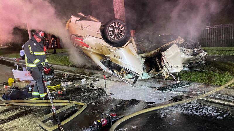 The tower 15 crew with the Orlando Fire Department jumped into action Monday when a car that crashed caught fire on Northlake Parkway and Narcoossee Road.